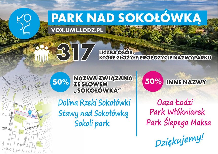 - Od trzech lat w budżecie obywatelskim realizowany jest projekt w zakresie rozbudowy i zagospodarowania tego terenu. Pojawiły się już miejsca do grillowania, urządzenia do zabawy dla dzieci, park trampolin i linowy, ławki. W tegorocznym budżecie partycypacyjnym wygrał trzeci etap rozbudowy tego terenu, w ramach którego powstaną kwietno – ziołowa łąka oraz potrzebny mieszkańcom monitoring. Ponieważ jest to nowy obszar, to wymaga on nazwania. W głosowaniu vox populi ponad trzystu łodzian zgłosiło swoje propozycje. Połowa z nich zawierała nazwę Sokołówka – poinformował Bartosz Domaszewicz.