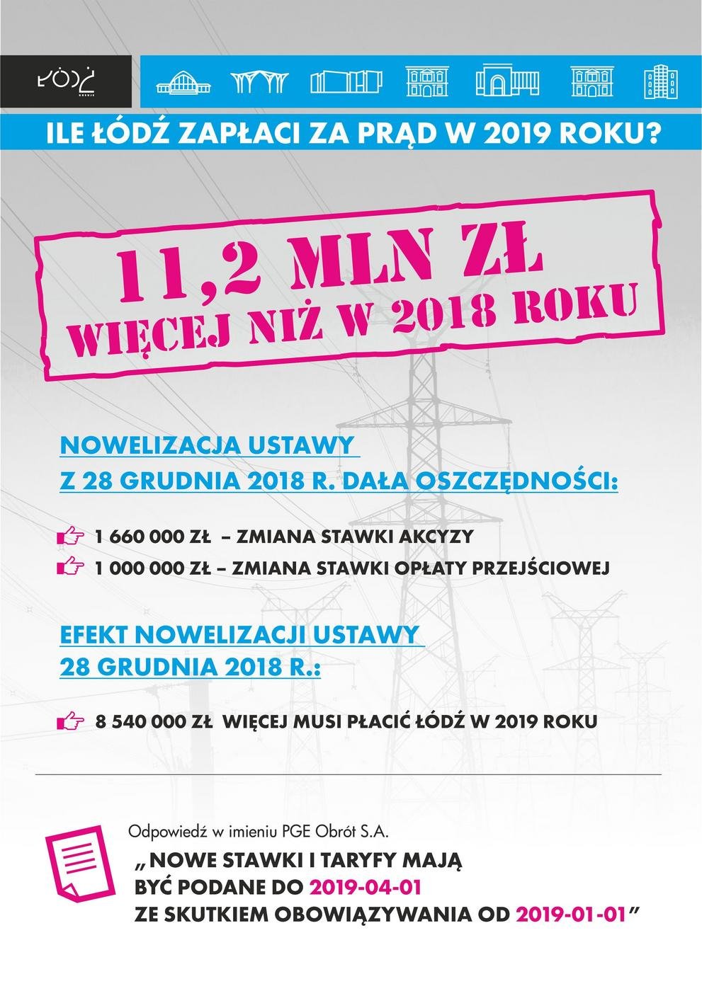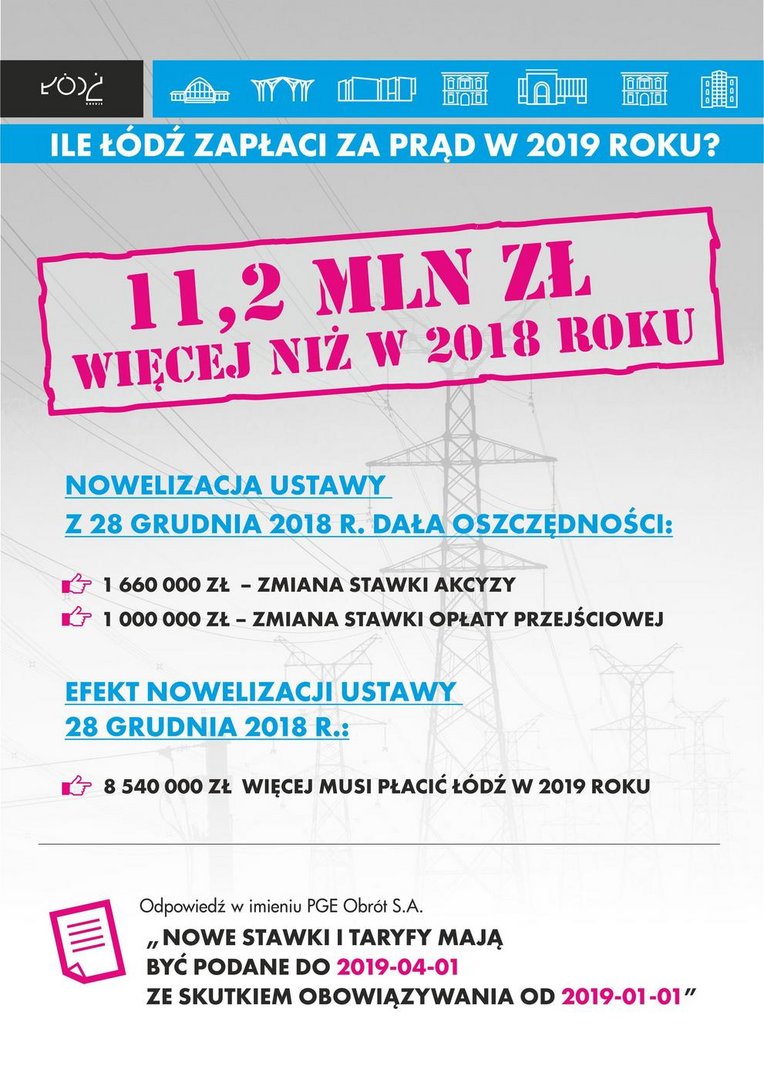 Łódzka Grupa Zakupowa skupia podmioty samorządu łódzkiego oraz z województwa łódzkiego a została utworzona aby negocjować korzystniejsze stawki u dostawców energii. I tak dotąd było, wspólne zakupy energii dawały spore oszczędności. Jednak w ostatnim przetargu PGE Obrót S.A. - zwycięzca przetargu - skalkulował ofertę po nowych, wyższych stawkach co oznacza dla Łodzi rachunki wyższe o 11,2 mln zł. Obniżka akcyzy i opłaty przejściowej dała oszczędności, ale nadal rachunek globalny jest zdecydowanie wyższy a znowelizowana w grudniu 2018 r. ustawa miała zagwarantować, że prąd jednak będzie nie droższy niż w 2018 r. Brakuje jednak aktów wykonawczych do ustaw, a samorządy, nie tylko z Łodzi i regionu biją na alarm, że nowe umowy są dużo droższe niż ubiegłoroczne.