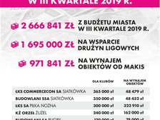 Podział pieniędzy na trzeci kwartał 2019 wygląda następująco: siatkarki ŁKS Commercecon (mistrzynie Polski) - 365 tys. zł + 48 479 zł na wynajem obiektu, siatkarki Budowlanych (wicemistrzynie Polski) – 350 tys. zł + 48 452 zł, piłkarze ŁKS (awans do ekstraklasy) – 300 tys. zł + 322 910 zł, żużlowcy Orła (1. liga) – 240 tys. zł + 162 tys. zł, rugbiści Budowlanych SA (wicemistrzowie Polski) – 120 tys. zł + 78 tys. zł, piłkarze Widzewa (2. liga) – 100 tys. zł + 312 tys. zł, koszykarki MUKS Widzew (ekstraklasa) – 100 tys. zł, piłkarki UKS SMS (ekstraliga) – 65 tys. zł, rugbiści KS Budowlani – 55 tys. zł.