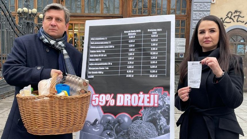 Tomasz Kacprzak, radny Rady Miejskiej w Łodzi: – Przygotowaliśmy dla Państwa koszyk Andrzeja Dudy, wówczas kandydata na Prezydenta RP, który, w marcu 2015 roku, zrobił zakupy na Żywiecczyźnie. Wówczas, za taki sam koszyk zakupów, jak ten, który dzisiaj kupiliśmy w sklepie, który jest za mną, zapłacił 37 zł. Tego samego dnia działacze PiS zrobili też zakupy na Słowacji, za które zapłacili w euro więcej niż w Polsce, bo około 50 zł. Natomiast za dzisiejsze zakupy, paragon jest sprzed kilkunastu minut, zapłaciliśmy prawie 59 zł. Wzrost cen to jest blisko 60% w ciągu 6 lat.