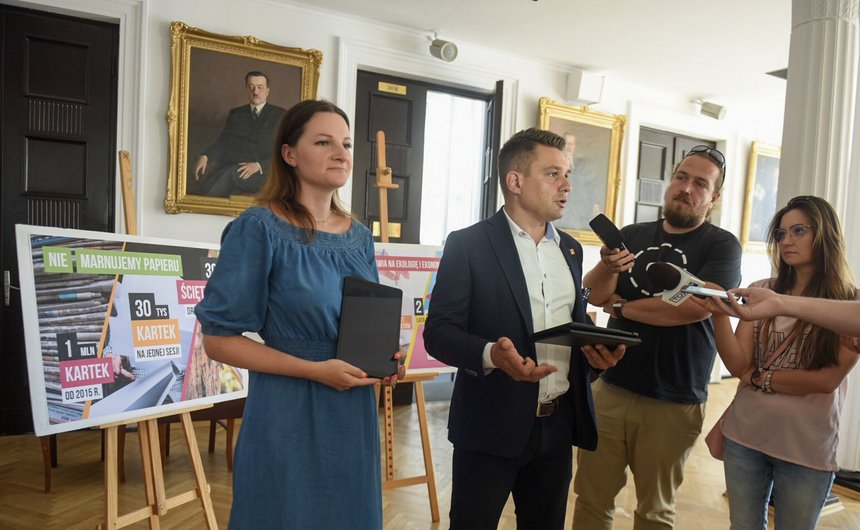 - Pomysł narodził się zaraz po rozpoczęciu kadencji, gdy skonfrontowani z górami wydruków po każdej sesji, porażeni marnotrawstwem papieru, zdecydowaliśmy o przejściu na elektroniczny obieg. W zeszłej kadencji zadrukowano milion stron, każdego roku wydając na ten cel 80.000 zł. Zakup tabletów zwraca się więc w zaledwie rok, kolejne lata to już oszczędności. Zaoszczędzony papier to także, a może przede wszystkim uratowanych przed siekierą 30 drzew – powiedział Marcin Gołaszewski.