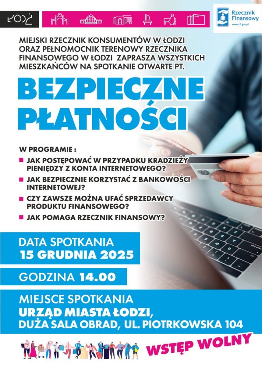 Miejski Rzecznik Konsumentów w Łodzi oraz Pełnomocnik Terenowego Rzecznika Finansowego w Łodzi zaprasza wszystkich mieszkańców na spotkanie otwarte „Bezpieczne Płatności”. Dowiesz się, jak postępować w przypadku kradzieży pieniędzy z konta internetowego, jak bezpiecznie korzystać z bankowości internetowej, czy zawsze można ufać sprzedawcy produktu finansowego oraz jak pomaga rzecznik finansowy.