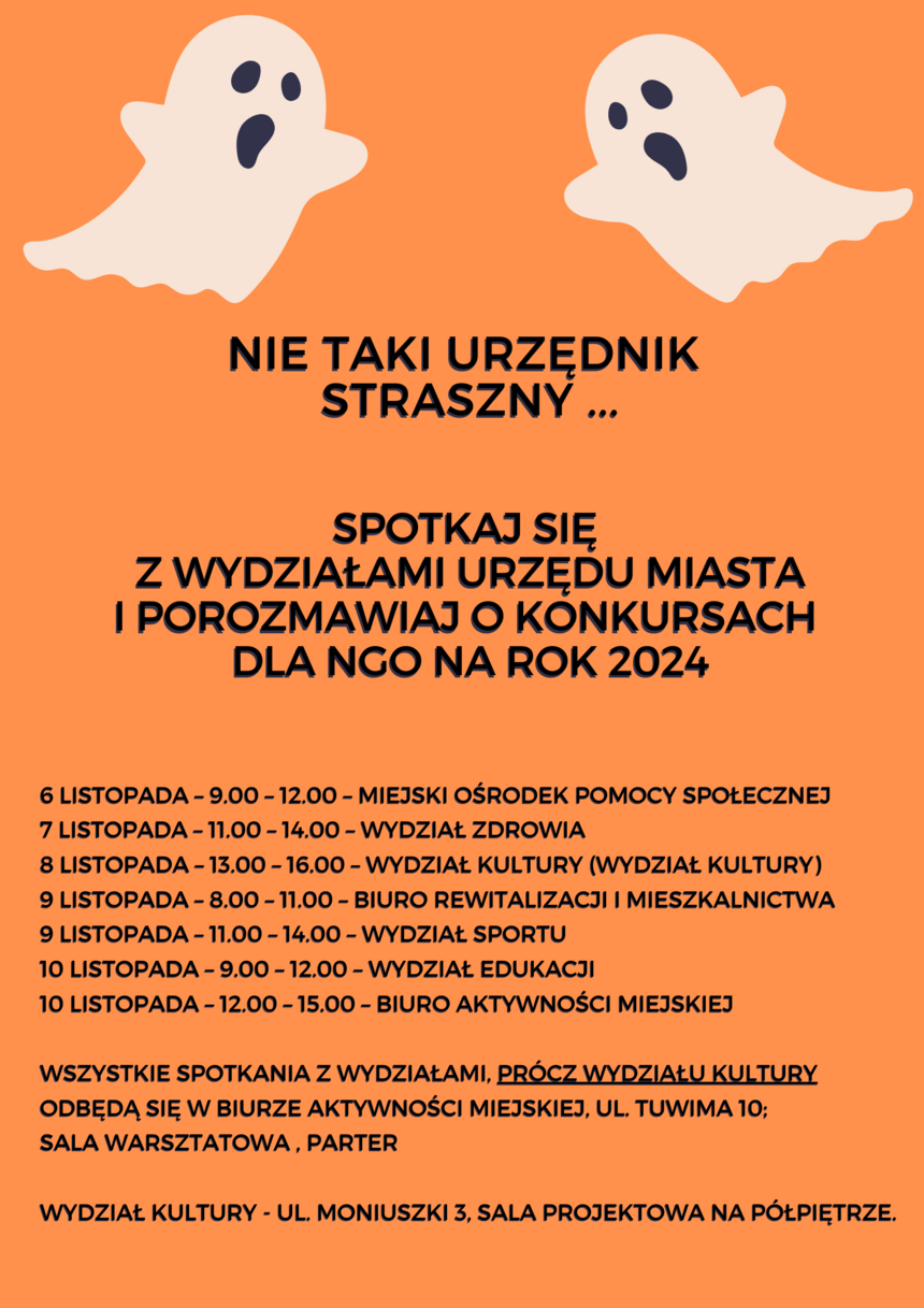 Zapraszamy wszystkie organizacje pozarządowe na spotkania odnośnie KONKURSÓW DLA NGO NA ROK 2024 - na każdym ze spotkań będą pracownicy konkretnych wydziałów, którzy chętnie odpowiedzą na pytania formalne i merytoryczne odnośnie przyszłorocznych konkursów.