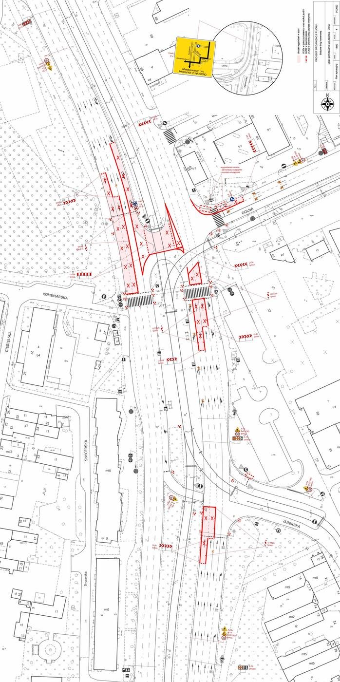 - Jadąc ul. Zachodnią do centrum na wprost przejedziemy lewym pasem do jazdy prosto przez skrzyżowanie z Dolną. Wygrodzone będą dwa prawe pasy ruchu. Nie będzie możliwości skrętu w lewo w ul. Dolną. Bez utrudnień pozostanie skręt w lewo w ul. Zgierską.