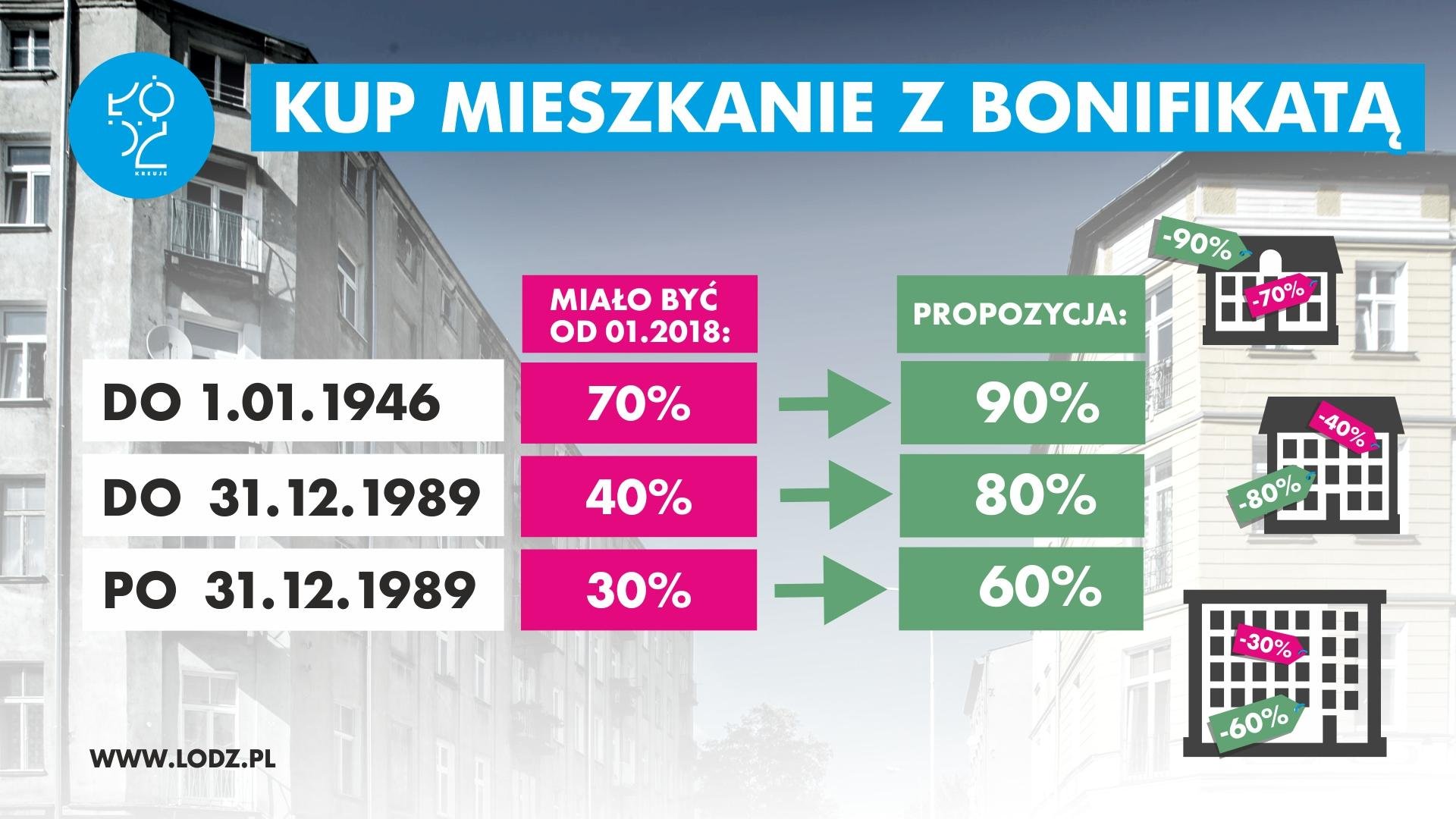 Bardzo atrakcyjnie przedstawiają się propozycje nowych zasad wykupu mieszkań komunalnych, z których w nowym roku wielu łodzian może skorzystać. Lokale w budynkach wybudowanych do 1 stycznia 1946 roku wykupić będzie można z 90-procentową bonifikatą zamiast obecnych 70 proc., do 1989 roku - 80 proc. bonifikaty zamiast dotychczasowych 40 proc., a w tych najnowszych wzniesionych od stycznia 1990 roku - propozycja zakłada 60 proc. bonifikaty zamiast 30 proc. Uchwała w tej sprawie trafi pod obrady Rady Miejskiej jeszcze w grudniu br.