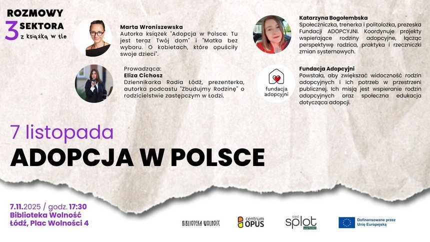 Zapraszamy na spotkanie z Martą Wroniszewską autorką książki “Tu jest teraz Twój dom. Adopcja w Polsce”, która przybliży nam historie adoptowanych dzieci - dziś już dorosłych, rodziców adopcyjnych, rodzin zastępczych i wychowanków domów dziecka, zmagających się z codziennością. To historie, w których osobiste dramaty przeplatają się z problemami niewydolnego systemu. Swoimi doświadczeniami podzieli się z nami również Katarzyna Bogołembska współzałożycielka Fundacji Adopcyjni, której misją jest wspieranie rodzina adopcyjnych i trudna edukacja społeczna w tym temacie, bo