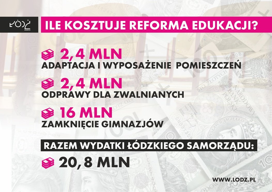 Łódki samorząd wydał już około 5 mln zł na dostosowanie pomieszczeń w szkołach podstawowych do potrzeb klasopracowni, wyposażenie pracowni przedmiotowych w pomoce do nauki chemii, biologii, fizyki oraz zakup niezbędnych mebli. Koszty i to niemałe generowały także odprawy dla zwalnianych nauczycieli gimnazjów, choć w części te wydatki zwróciło ministerstwo. Największą kwotę, bo według szacunków aż 16 mln zł, pochłonie dostosowanie szkół średnich do potrzeb skumulowanych roczników.