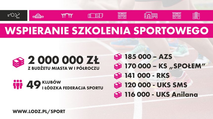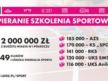 Z 2 mln zł przeznaczonych na wsparcie szkolenia dzieci i młodzieży w łódzkich klubach sportowych w pierwszym półroczu 2019 najwięcej pieniędzy trafi do AZS, który otrzyma 185 tys. zł. . Na 170 tys. zł może liczyć KS Społem, a na 141 tys. zł – RKS. Do kasy UKS SMS wpłynie natomiast 120 tys. zł, a UKS Anilana otrzyma 116 tys. zł. Łącznie wsparcie dostanie 49 klubów i Łódzka Federacja Sportu.