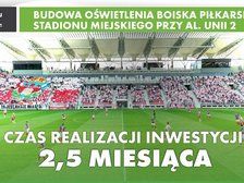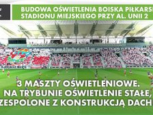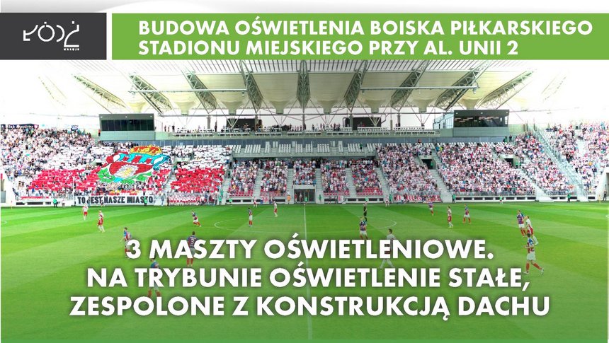 Dyrektor Zarządu Inwestycji Miejskich Agnieszka Kowalewska - Wójcik poinformowała, że umowę podpisano w piątek o godz. 11. Inwestycja ma być zrealizowana w okresie 2,5 miesiąca. W tym czasie na istniejącej trybunie zostanie zainstalowane oświetlenie zespolone z konstrukcją dachu, a po przeciwległej stronie powstanie tymczasowa instalacja, na której lampy będą zawieszone na trzech masztach.