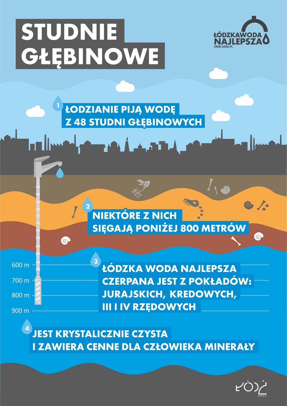 Łódzkie studnie głębinowe sięgają pokładów znajdujących się na głębokości od kilkudziesięciu metrów (ujęcia czwartorzędowe) do nawet 300-900 metrów (ujęcia górno i dolnokredowe oraz górnej jury). Z roku na rok odbudowują się zasoby wód podziemnych, z których rabunkowo korzystał łódzki przemysł włókienniczy.