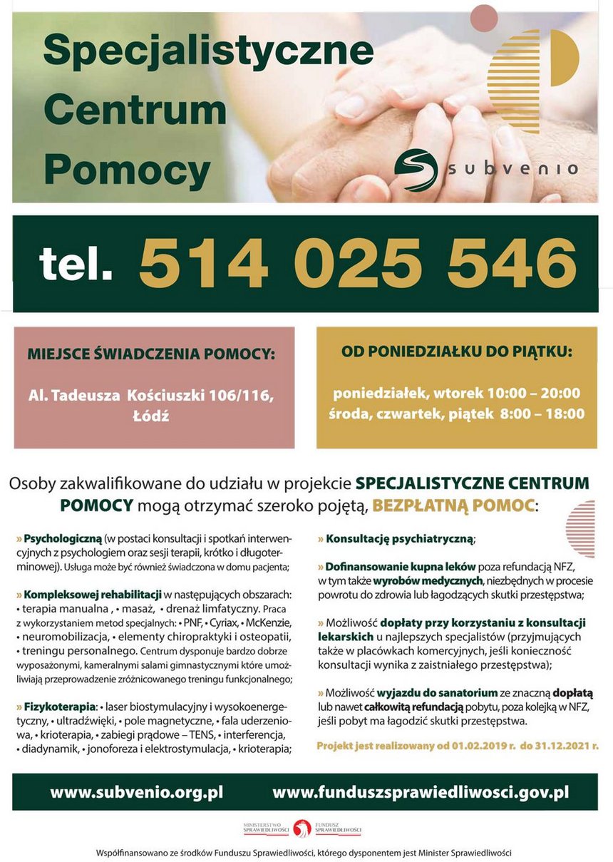 Od 01.02.2019r Fundacja Subvenio rozpoczęła w Łodzi realizację projektu: „Specjalistyczne Centrum Pomocy” dla osób pokrzywdzonych przestępstwem. W 2020 roku uruchomiliśmy obiekt Centrum, doskonale wyposażony, dostępny dla osób z niepełnosprawnością, mieszczący się w ścisłym centrum miasta.