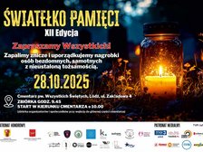 W tym roku Światełko Pamięci odbędzie się we wtorek 28 października o godz. 10. Zbiórka jest zaplanowana o godz. 9.45 przy wejściu prowadzącym do głównej części cmentarza pw. Wszystkich Świętych przy ul. Zakładowej 4 na Olechowie. Zainteresowanych uczestników akcji wolontariusze i pracownicy Koła Łódzkiego Towarzystwa Pomocy im. św. Brata Alberta będą częstować ciepłą herbatą.