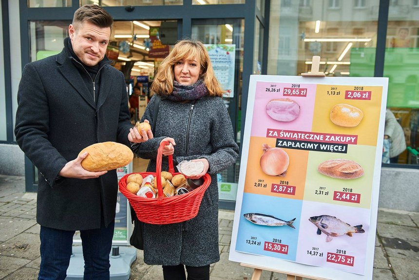 - W standardowym koszyku świątecznym znajdują się produkty, których cena w roku ubiegłym wynosiła około 70-ciu zł. Dziś za te same rzeczy trzeba zapłacić już 90 zł. Niestety najbardziej podrożał karp, którego cena wzrosła około 10-ciu złotych na kilogramie. Teraz trzeba zapłacić 22,75 zł. Chleb w 2017 roku kosztował średnio 2,31 zł, a obecnie – 2,44 zł. Szynka kosztowała rok wcześniej 26,26 zł, a obecnie – 29,65 zł. Cena ziemniaków wzrosła aż dwukrotnie. Przyczyną podwyżek jest zwiększenie cen paliwa. Szykują się także podwyżki cen energii. Obserwujemy początki drożyzny w naszym kraju. Alarmujemy mieszkańców, do czego może doprowadzić nieodpowiedzialna polityka gospodarcza.